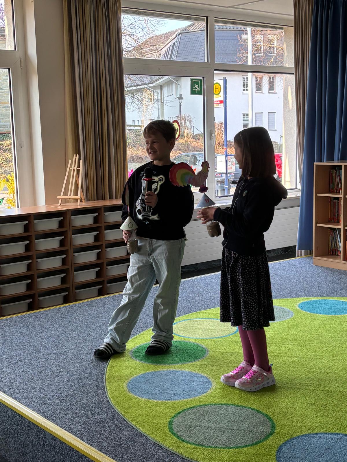 In einer wertschätzenden Atmosphäre präsentierten die Klassen stolz ihre Ergebnisse: Die Klasse 1a führte ihren ersten Kanon mit Bewegungen vor, Klasse 3a präsentierte ihren selbst gebauten Wetterhahn und die 4. Klassen zeigten ihre Kunstwerke und selbst gebauten Instrumente. Ein Mädchen aus der 3b wurde besonders gefeiert, da sie in ihrer Freizeit den Schulhof von Müll befreit hat. Wir sagen an alle fleißigen und kreativen Schülerinnen und Schüler ein herzliches Dankeschön!