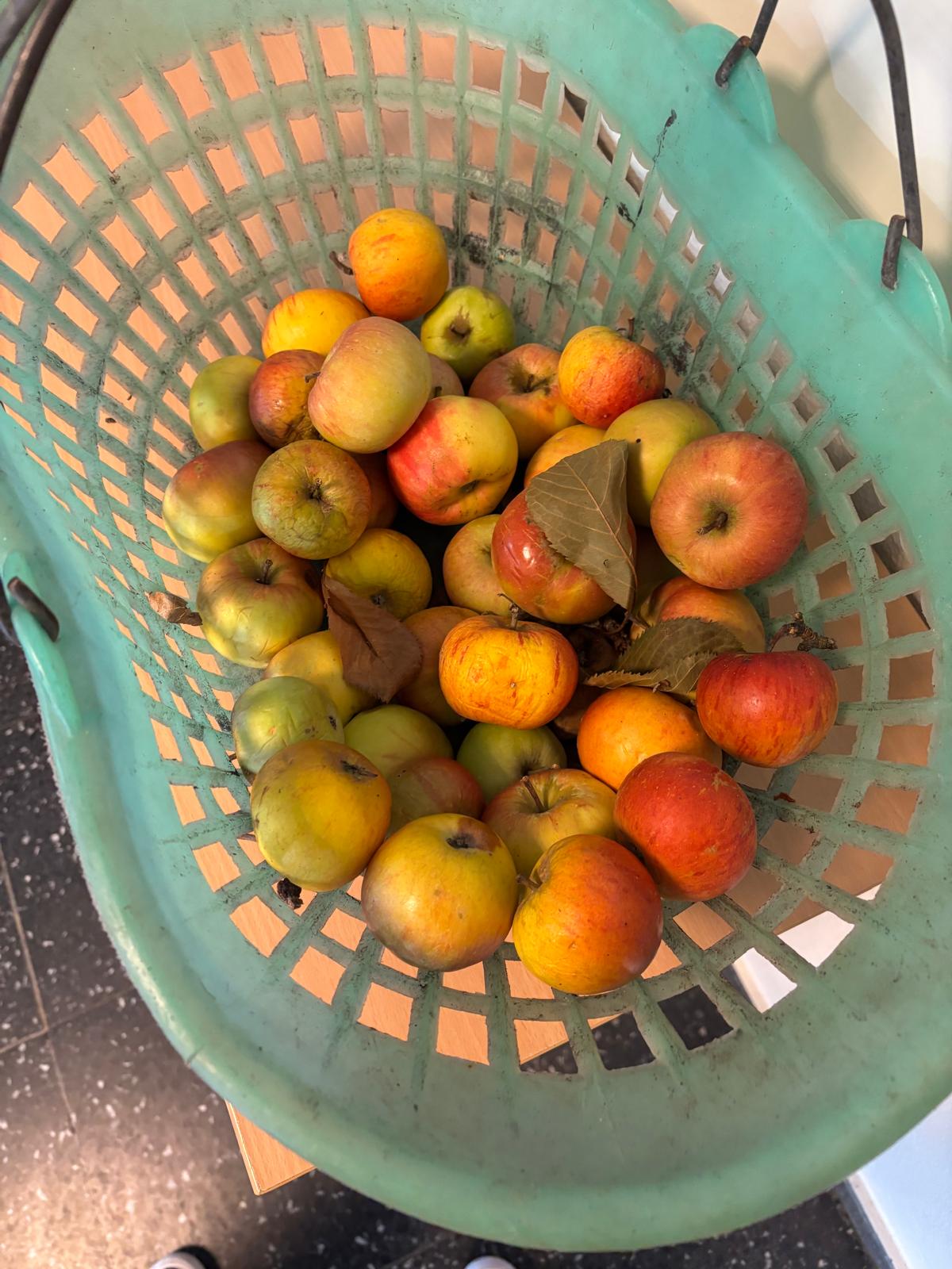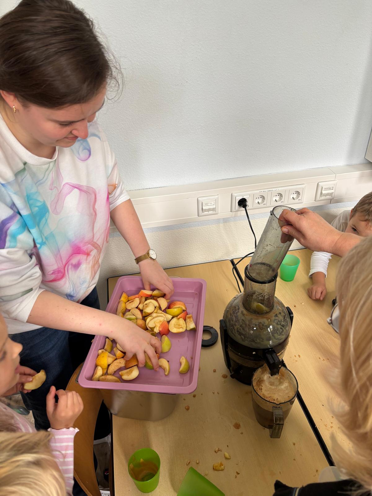 Ein besonderes Highlight war die Apfelernte: Gemeinsam sammelten die Kinder Äpfel, wuschen und zerkleinerten sie fleißig – und durften schließlich selbst erleben, wie daraus frischer Apfelsaft gepresst wurde.