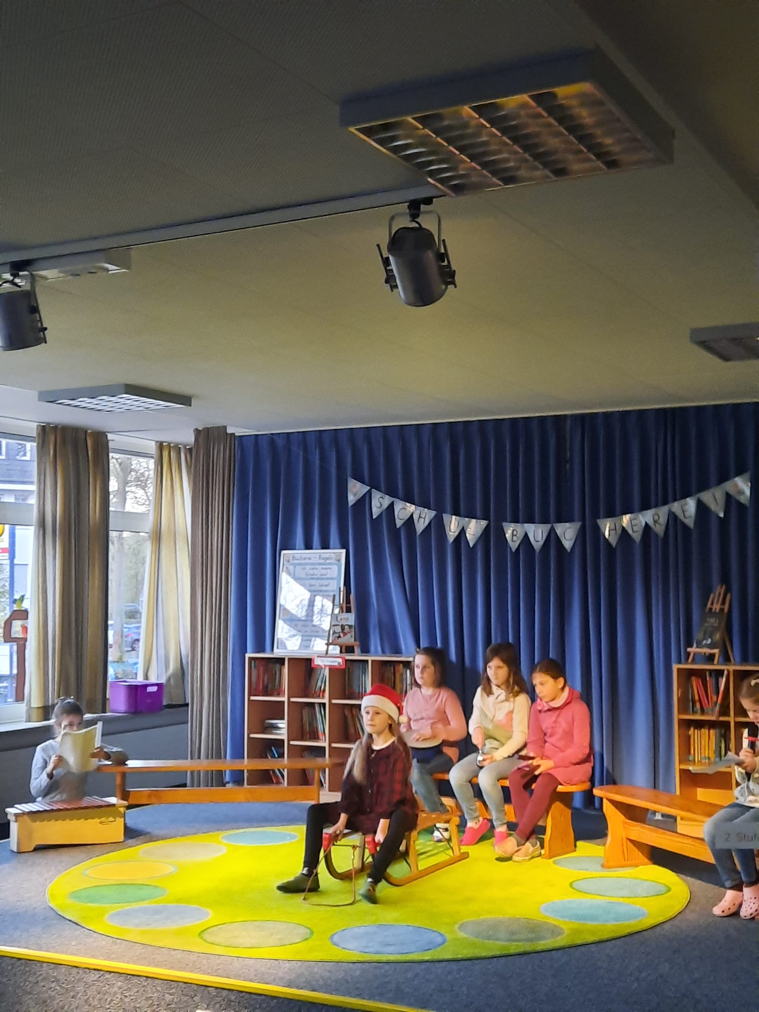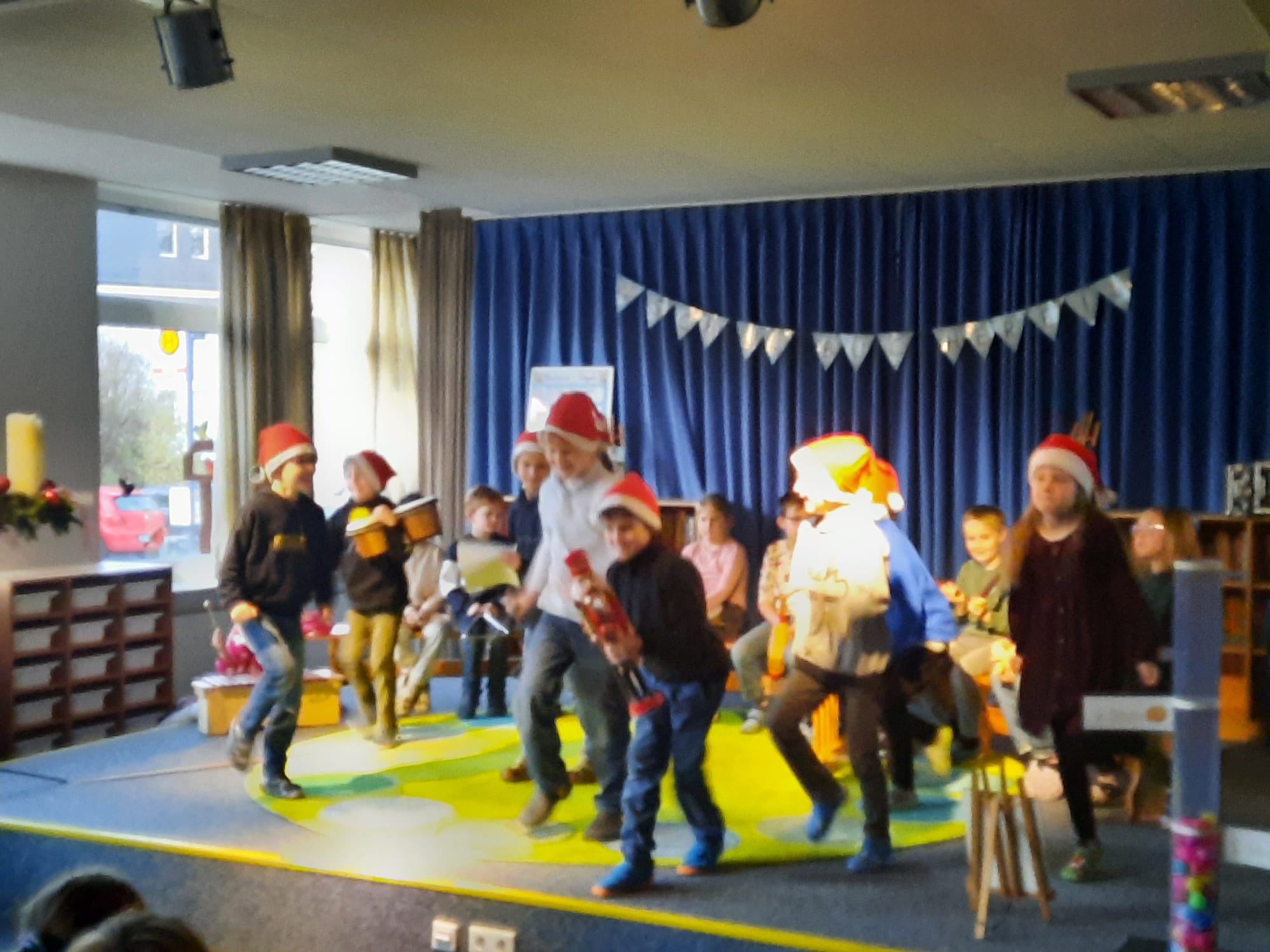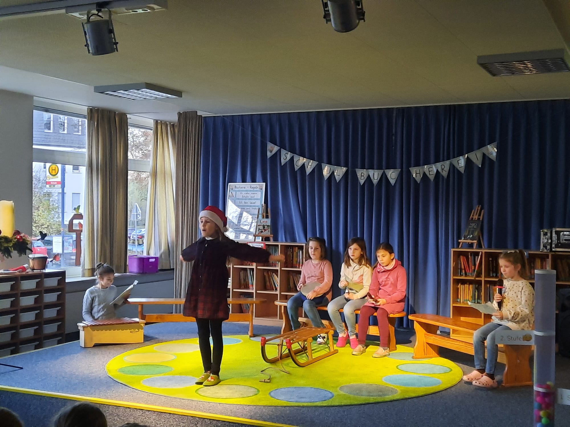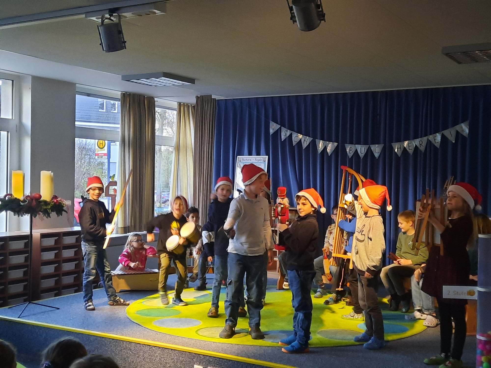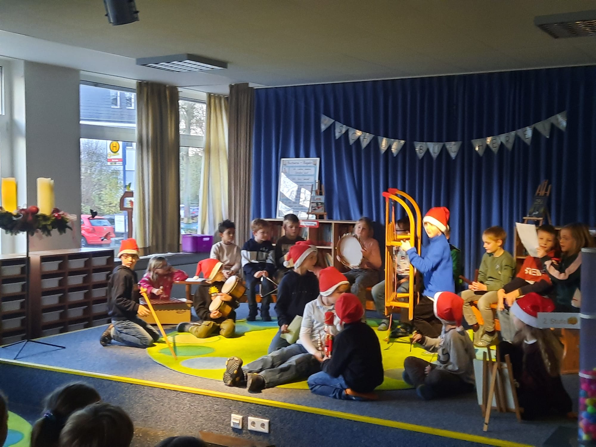 Besonders aufregend war der Auftritt der Klasse 2a. Die Kinder hatten zwei schöne Klanggeschichten vorbereitet. Mit Trommeln, Rasseln, Glöckchen und vielen anderen Instrumenten ließen sie eine Wintergeschichte lebendig werden. Mal klang es wie knirschender Schnee, mal wie ein fröhliches Durcheinander in einer Wichtelwerkstatt – und alle hörten ganz gespannt zu.