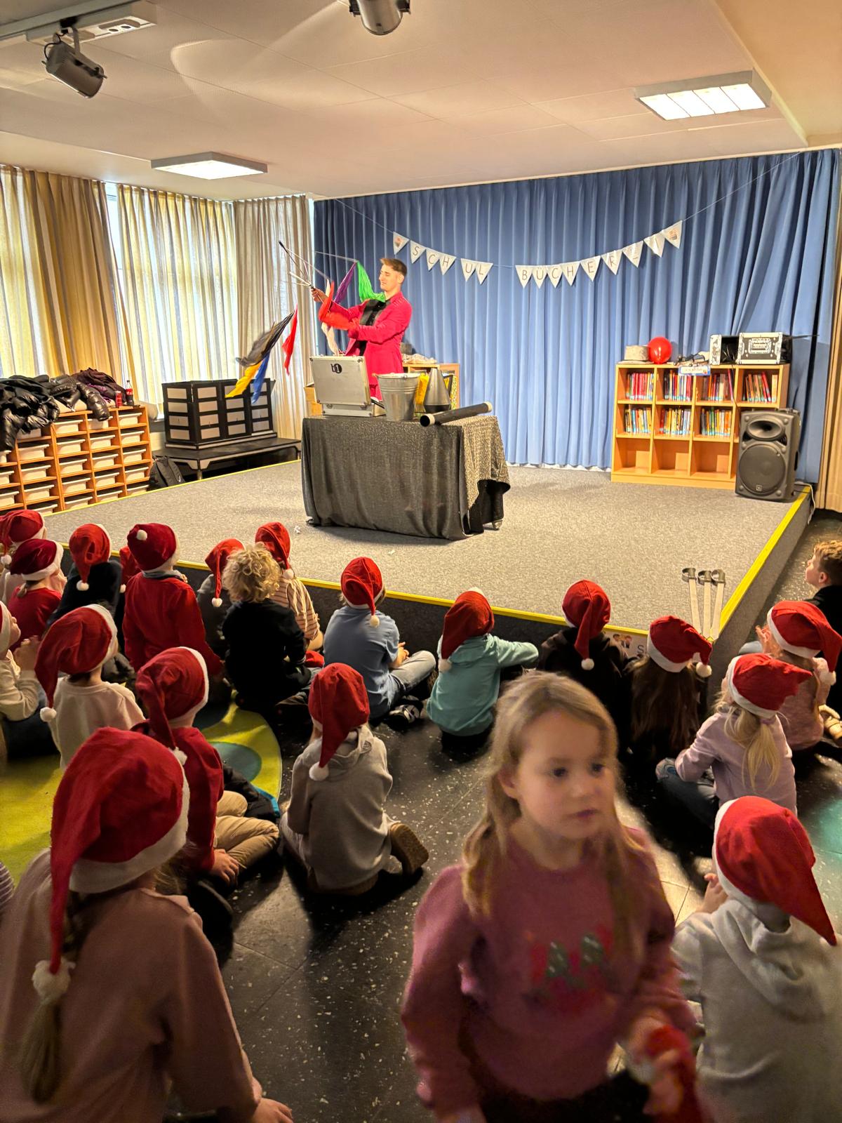 In seiner mitreißenden Show zeigte er den Kindern verblüffende Tricks, ließ Gegenstände erscheinen und verschwinden und bezog alle Kinder interaktiv in die Performance mit ein. Die Schülerinnen und Schüler konnten mitraten und ihm bei seinen Künsten unterstützen. Manch ein Trick sorgte für lautes Staunen und begeisterten Applaus!