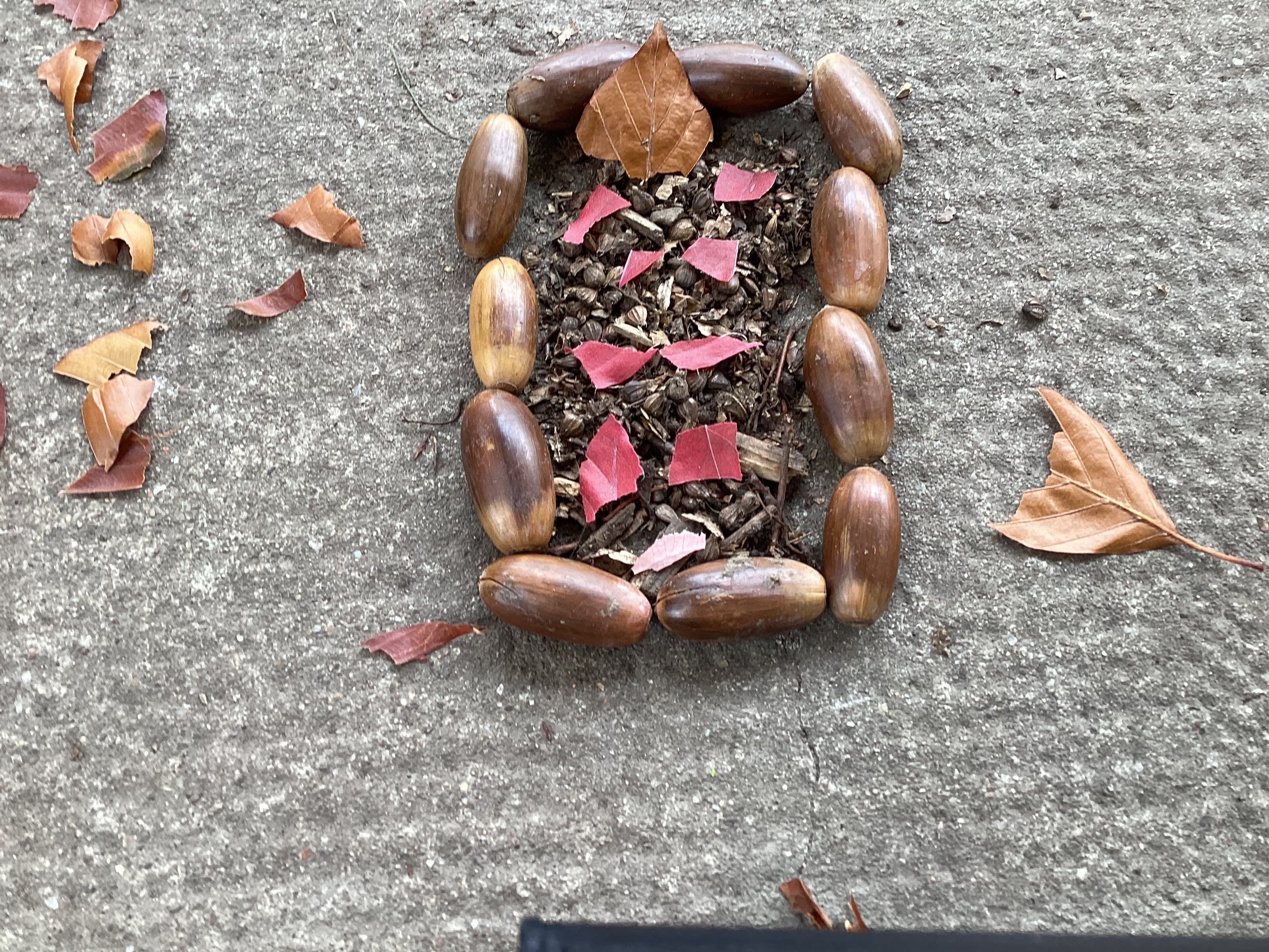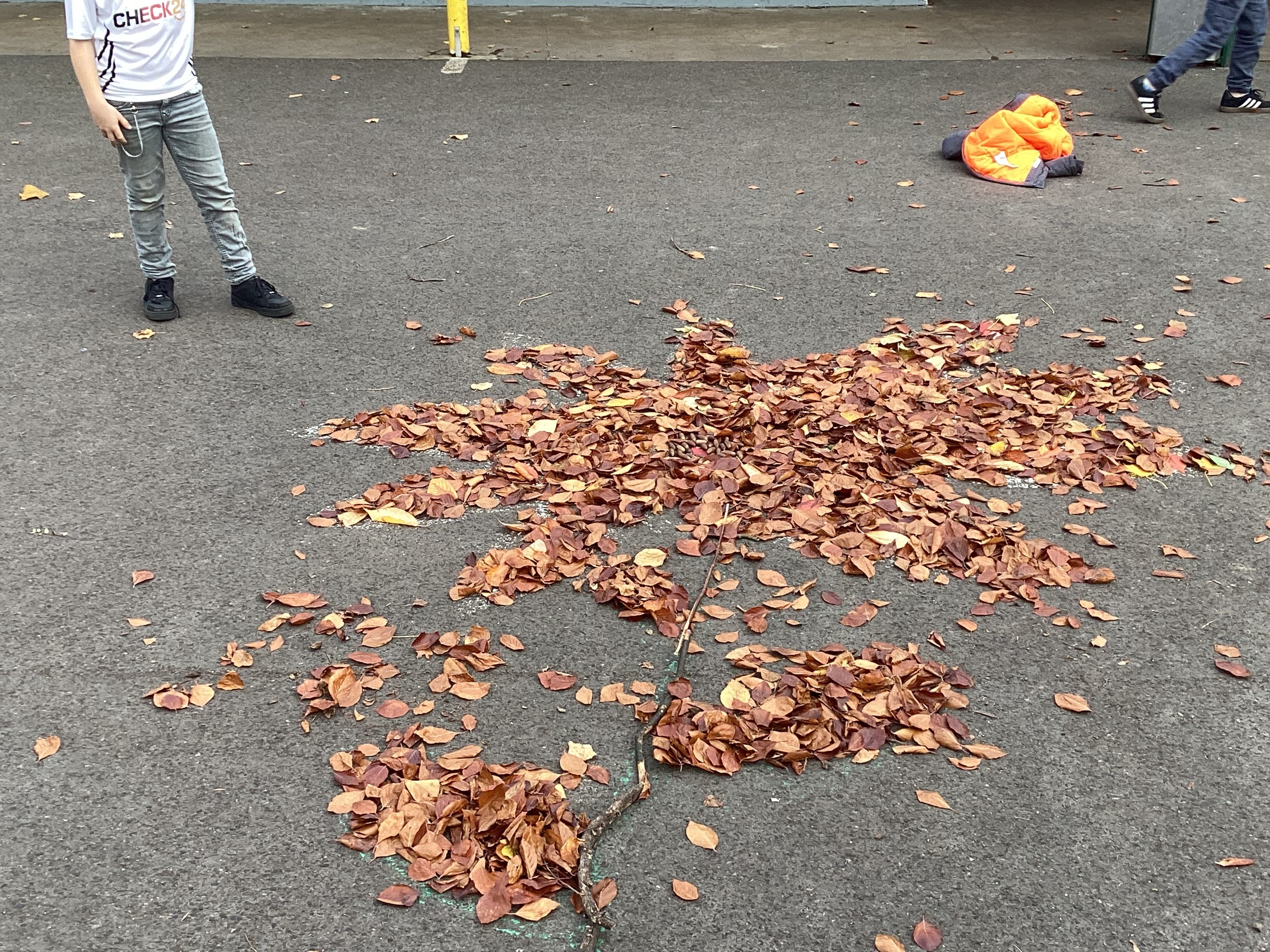 Die Klasse 4b hat im Kunstunterricht kreative Landart- Kunstwerke aus Naturmaterialien gestaltet. Mit Blättern, Steinen und Ästen entstanden fantasievolle Formen und Muster auf dem Schulgelände.